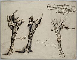 Inscr. h. dr. à l’encre brune : [sept lignes raturées] ; c. g. à l’encre brune : la rotule plus /en dedans. ; c. à l’encre brune : Etude pour les chevaux / du St .Sebastien. –