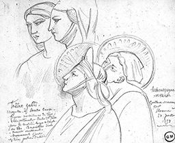Inscr. b. g. : Taddeo Gaddi – / chapelle – à Santa Croce – / – figures merveilleuses de type – / – – de sentiment – Etudes à faire / – pour le modelé – large α simple – / – des têtes Compositions d’une / – naiveté charmante – / – mouvements d’une – / extrême justesse d’intention. ; b. dr. : [deux lignes raturées] / Florence