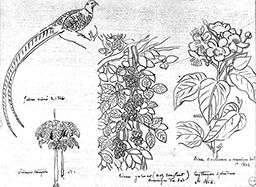 Copie de faisan d’après « Faisan vénéré », Le Tour du Monde, 2nd semestre 1864, p. 328. Copie de palmier d’après « Palmiers tarapote », Le Tour du Monde, 2nd semestre 1864, p. 156. Copie de liane d’après « La liane yahuar cencca (le nez sanglant) », Le Tour du Monde, 2nd semestre 1864, p. 132. Copie de Bixa orellana d’après « Bixa orellana (rocou) », Le Tour du Monde, 2nd semestre 1864, p. 143
