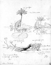 Inscr. h. c. : cœur jaune Safran. / Blanc laiteux verdatre ; c. dr. : lilas / cœur jaune / orpin / feuilles Beau vert clair veronèse ; c. : reflets ; b. g. : vert pâle très clair jaunâtre / cœur brun jaune / idem. / racines / reflets / Serres du Jardin des Plantes / (Moïse exposé) / fixé – ; b. dr. : cœur jaune orpin jaune / fleurs blanches / feuilles vertes veronèse / reflet / une rigole d’eau au centre de / chaque feuille