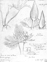 Inscr. h. dr. : [mot raturé] / 8 centimètres. / vert pâle jaunâtre ; c. dr. : Diamètre / 10 centimetres ; b. g. : Serres du Jardin des Plantes / Plantes aquatiques. / fixé ; b. dr. : fleur rose carmin legerement violassé / comme la fleur du laurier rose. / cœur rouge Saturne foncé / – α jaune safran foncé / tige vert olivatre rousse / vert Bronze / vert / Blanc / fleur blanche