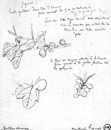 Inscr. h. : figuier. / feuille grandeur d’une tete d’homme / fruit variant de 5 à 10 centimetres de / long sur 8 à 7 de large / bout des tiges très vert vert chenille [mot illisible] / tronc α branches gris violasse très dou / tronc lisse avec taches noiratres / tigrées ; c. dr. : – le fruit est toujours attaché à la branche / grise jamais à la partie feuillue verte / des extrémités ; b. dr. : Honfleur – figuier –
