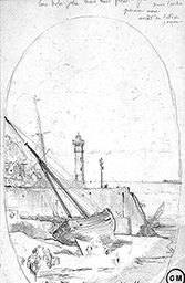 Inscr. h. : bord de la jetée noir vert foncé pierres rosâtres / dans l’ombre / Phare ocré / mât du bateau / jaune ; b. dr. : Honfleur.