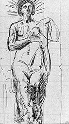 Plume et encre noire sur papier gris. Mise au carreau à la mine de plomb