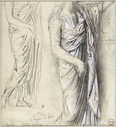 Inscr. c. dr. à la mine de plomb : [deux lignes raturées] ; b. c. à la mine de plomb : 4me essai de / la draperie du Tyrtée ; b. g. à la mine de plomb : Tyrtée