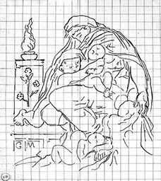 Plume et encre brune sur papier-calque contrecollé. Mise au carreau à la mine de plomb