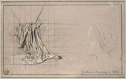 Mine de plomb, gouache blanche sur papier gris rosé. Mise au carreau partielle à la mine de plomb