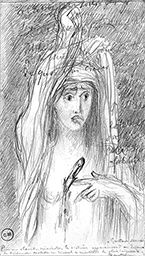 Inscr. h. c. : [mot illisible] / [deux lignes raturées] / à la chute du [mots illisibles] / De quoi vous crever les yeux ; c. dr. : [cinq lignes raturées] / ; b. : – Pour une chambre criminelle. la victime apparaissant au dessus – / – du tribunal soulève son linceul α montrant la plaie saignante – / le couteau