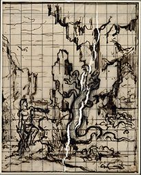 Plume et encre brune, mine de plomb sur papier-calque contrecollé. Mise au carreau à la mine de plomb