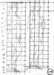 Mine de plomb sur papier-calque contrecollé. Mise au carreau numérotée à la mine de plomb