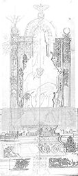 Inscr. h. g. à la mine de plomb : mettre ici – / la tête de / la ceinture / du roi si on / trouve un / autre ornement / pour cette / ceinture ; c. dr. à la mine de plomb : chapiteau sassanide / Grammaire de / Style assy / idem / chapiteau α / S te Sophie / base des pilastres ; b. g. à la mine de plomb : {dans la frise du fond de la salle ; b. dr. à l’encre noire : St ambroise / p / ; à la mine de plomb : – Salomé