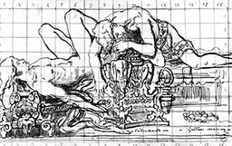 Plume et encre noire sur papier-calque contrecollé. Mise au carreau numérotée à la sanguine
