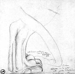 Inscr. b. c. : cette dernière phalange / plus visible / [mot barré] / [mot barré] ; b. dr. : le dedans / de la patte / patte gauche de derrière – / – antiques – Louvre