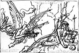 Inscr. h. dr. à la mine de plomb : l’ange sonne la trompette présente / du pain sur un livre ; b. g. à la mine de plomb : Prométhée présente sa / poitrine au vautour ; b. dr. à la mine de plomb : il se couvre la tête sa pose est celle de / [quatre mots illisibles] être replié sur lui-même