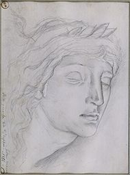 Ce dessin est inspiré de la tête de l’Esclave mourant de Michel-Ange, dont Gustave Moreau possédait une copie en plâtre (Inv. 16076).