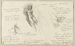 Inscr. h. g. : lumière – aux cheveux / a l’endroit du garot. / repousser la lumière / du col du taureau / du coté de la femme . ; h. dr. : allonger un peu les cheveux qui / volent . / etendre un peu / l’ombre derrière la tete / de la femme sur la draperie / lumiere – / volante en hauteur – / c. dr. : lumière / derrière le pied / α la queue / [mot illisible] / rappel de lumiere / sur la draperie / bleue . ; b. g. : eclairer le ventre / du coté de l’ombre / de draperie / lumière sous le / genou plié dans le / mouvement de la jambe. ; b. c. : Lumière sur la draperie rose / a l’endroit du mollet de la femme . / en regardant le / tableau ; b. dr. : lumiere – plus franche / jaune sous le ventre / du taureau / rappel de lumière sur une / ou deux des plantes / du 1er plan celle allant a gauche