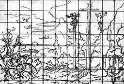 Plume et encre noire sur papier-calque contrecollé. Mise au carreau à l’encre noire