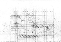 Pierre noire sur papier-calque contrecollé. Mise au carreau numérotée à la mine de plomb