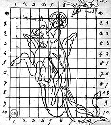 Plume et encre noire sur papier-calque contrecollé. Mise au carreau numérotée à l’encre noire