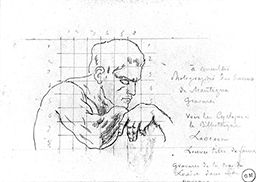 Inscr. dr. à la mine de plomb : à consulter / Photographie des buveurs / de Mantegna / Gravures / Voir les Cyclopes à / la Bibliothèque / Laocoon / Louvre têtes de faunes / Gravures de la cour du / Louvre dans mon / ouvrage