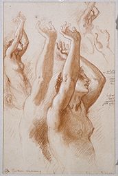 Inscr. c. dr. à la pierre noire : œil [?] plus / Sous le côté / [trois lignes à la sanguine barrées à la pierre noire] ; à la mine de plomb : le bras / – droit / [mot à la sanguine barré à la mine de plomb] / ; à la pierre noire : juste – –