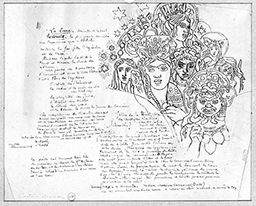 Inscr. h. g. à l’encre brune : La Lune . ; à la mine de plomb : divinités de la nuit ; g. à l’encre brune : [mot barré] – la plus grande divinité / du Paganisme après le Soleil . / Hésiode la fait fille d’Hypérion / et de Théa . / Pindare l’appelle l’œil de la / Nuit et Horace la Reine du / Silence – / une partie des orientaux / l’honoraient sous le titre d’Uranie / C’est : l’Isis des Egyptiens / l’astarté des Phéniciens / la méni et la reine du ciel / des Hébreux / la Mylitta des Perses . / l’Alilat des Arabes / la Sélené des Grecs . / et la Diane la Venus la Junon des Romains / Les magiciennes de thessalie disaient / avoir un grand commerce avec la lune / et se vantaient de pouvoir par leurs / enchantements ou la délivrer du / dragon qui voulait la dévorer ou / la faire à leur gré descendre sur la terre / Adorée sous trois noms Diane sur terre Lune dans le ciel / et Hecate aux Enferts / autres / dénominations / Astarté / Phoebé ; b. g. à l’encre brune : les poètes lui donnent trois têtes / la première de cheval . la 2ème de femme / ou de laie et la troisième d’un chien / d’autres celles d’un taureau d’un chien / et d’un lion ; b. c. à l’encre brune : Filles de la Nuit – fille / du chaôs (des ténèbres) / (Sémélé –.) mère des furies . / mère des Dieux / suivant Orphée . / épouse de l’Erèbe / Aristophane l’a peint étendant ses / vastes ailes α déposant un œuf dans le / sein de l’Erèbe d’où sortit l’amour aux / ailes dorées (théogonie des Egyptiens) qui / faisaient de la nuit le principe de toutes / choses α qui la nommaient – Athyr – / elle avait pour enfants l’Ether et le Jour / mais elle avait engendré seule sans le commerce d’aucuns Dieux / l’odieux destin la parque noire la mort le sommeil la troupe / des Songes . Momus, la misère les Hespérides gardiennes des pommes / d’or . les Parques Némisis . la fraude la concupiscence la vieillesse la / Discorde – tout ce qui était pernicieux et terrible passait pour une / production de la nuit . / (Varron) Nox – a nocendo – nutrix maxima Curarum (Ovide) / on lui immolait une brebis noire le hibou lui était consacré α aussi le coq