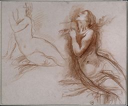 Sanguine, craie blanche, pierre noire sur papier rosé