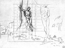 Mine de plomb sur papier-calque contrecollé. Mise au carreau partielle numérotée à la mine de plomb