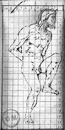 Plume et encre brune, mine de plomb sur papier-calque contrecollé. Mise au carreau numérotée à la mine de plomb
