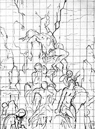 Plume et encre brune sur papier-calque contrecollé. Mise au carreau à la mine de plomb