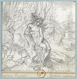 Inscr. b. g. sur le dessin : un satyre se rit de lui – ; b. g. sur la feuille de montage : Apollon berger – ; b. dr. sur le dessin : Envie basse