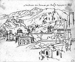 Sujets iconographiques : Saint Sébastien aux archers ; Paysage non identifié
