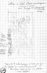 Inscr. h. : tableau à l’entrée a droite Musée Campana / Vierge α Saints / noir sur gris avec jaunes verts / olivatres / α roses . ; c. g. : blancs / laiteux / [mot illisible] / [mot illisible] / rouges carmins / or bitume / mettre une / echarpe / aux anges . ; b. c. : voir à la 2 salle Campana à contre jour près / la fenêtre un massacre des innocents / les enfants sont en tas au pied du / trone d’herode