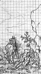 Plume et encre noire, mine de plomb sur papier-calque contrecollé. Mise au carreau à la mine de plomb