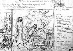 Inscr. h. : Thésee [mot raturé] traine après lui le minotaure par les cornes – / Thésee sort souilé de sang il aspire l’air les narines ouvertes / Expression de la Figure radieuse α unifiee corps souillé de sang – / il n’appercoit pas Ariane evanouie à la porte ; dr. : grands / oiseaux de proie dans la voute / corbeaux dans le bas / Ariane – / fond vert avec rocher gris – / ciel bleu / labyrinthe violet / derrière – gris cendres / violets α roux – par / places – plans violets / α argentés – / thésee rouge manteau / bleu – epée vermillon – / ariane . cheveux bruns dores / manteau rose / tunique noir α ornements / d or – / fil orange – / tracer l’ariane dans / la Demi teinte / ossements humains / sur les premiers plans / le minotaure traine par / la tête ou par un / pied – beau geste / antique –
