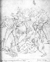 Copie d’après Luca Signorelli, Les Signes précurseurs de la fin du monde, détail (Orvieto, cathédrale, chapelle Saint-Brice), reproduit dans Stampe del Duomo di Orvieto. Dedicate alla Santità di Nostro Signore Pio Sesto Pontifice Massimo, Rome, 1791, tav. XXX