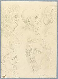 Copie de buste d’homme d’après le Maître de la Pala Sforzesca (attribué à), Buste d’homme (Milan, bibliothèque Ambrosienne, Inv. 1968). Copie de tête de vieil homme d’après un suiveur de Bramante (attribué à), Tête de vieil homme (Milan, bibliothèque Ambrosienne, Inv. 1618). Copie de coiffure d’après un suiveur de Giovanni Antonio Boltraffio, Buste de femme, détail (Milan, bibliothèque Ambrosienne, Inv. 1645). Copie de buste d’homme d’après un imitateur du Maître de la Pala Sforzesca, Buste d’homme (Milan, bibliothèque Ambrosienne, Inv. 1966). Copie de tête d’homme d’après le Maître de la Pala Sforzesca, Tête d’homme (Milan, bibliothèque Ambrosienne, Inv. 1967)