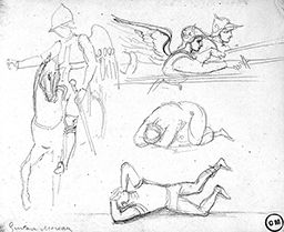 Copies de saint Ephèse, d’ange et de soldat casqués, d’homme tombé à terre d’après Spinello Aretino, Combat de saint Ephèse contre les païens de la Sardaigne, détails (Pise, Campo Santo). Copie d’homme agenouillé d’après Spinello Aretino, Les Martyres de saint Ephèse et Petito, détail (Pise, Campo Santo)