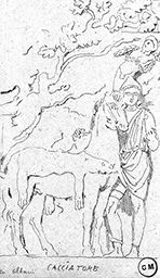 Copie d’après Cacciatore, bas-relief (Rome, villa Albani), reproduit dans Li bassirilievi antichi di Roma incisi da Tommaso Piroli colle illustrazioni di Giorgio Zoega, pubblicati in Roma da Pietro Piranesi, Rome, 1808, t. I, tav. XXXVII