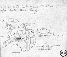 Inscr. h. g. : se rappeler les tons de la mosaïque de S. Miniato / [mot illisible] colorations blanches [mot illisible] ; c. g. : blanc / bleu foncé blanc / gris / blanc ; b. dr. : cassette rouge / draperie blanche / avec [mot illisible] bleu [mot illisible] – / beaux verts sombres / malachites