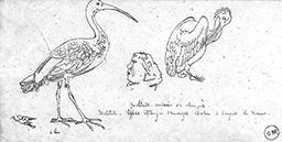 Copie d’ibis d’après « Ibis vivant », Le Magasin pittoresque, 1852, p. 128. Copie de pélican d’après « Le phoque », détail, Le Magasin pittoresque, 1852, p. 369