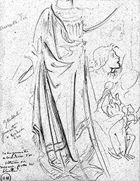 Inscr. h. g. à la mine de plomb : cuirasse d’or ; c. g. à la mine de plomb : Ghilberti / [mot illisible] / α broderies / d’or ; b. g. à l’encre noire : robe jaunâtre / a broderies d’or – / bittume ou / momie – frotté sur / blanc –