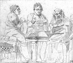 Copie d’après La Consultation chez la magicienne, mosaïque, maison de Cicéron, Pompéi (Naples, Musée national archéologique, Inv. 9987)