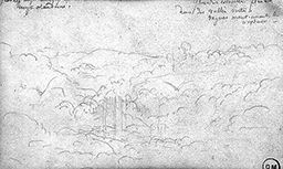 Inscr. h. g. : [deux mots illisibles] temple antique des [mot illisible] / Temple abandonné. ; h. dr. : Grandes corneilles sombres plein air / dans des vallées vertes. / vagues moutonnantes de / verdure –