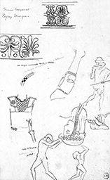 Inscr. h. g. à la mine de plomb : Musée Campana / Bijoux Etrusques – ; c. g. à l’encre noire : au casque ornements noirs α blancs ; à la mine de plomb : au casque ornements noirs α blancs ; b. g. à l’encre noire : Vases de Campana / ; à la mine de plomb : prétendants Voir / ; à l’encre noire : pretend.