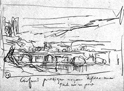 Inscr. b. : Enfant prodigue voyans défiler une / foule sur un pont