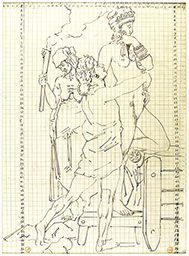Plume et encre noire sur papier-calque contrecollé. Mise au carreau à la mine de plomb, numérotée à l’encre noire