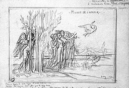 Inscr. h. dr. : – Aquarelle – a appartenu – – / à messieurs Tesse – Petit – Hayem / / – MUSES ET L’AMOUR – ; b. g. : L’amour regarde les nobles vierges. Il craint d’être vu α il / [mot illisible] cet hymne sacré pleuré par les neuf sœurs. / un cygne s’envole. campagne doucement éclairée – – fonds neigeux limites infranchissables – – le groupe forme le faisceau – ou la gerbe –