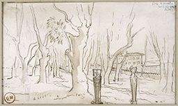 Inscr. h. dr. à la mine de plomb : bosco 8 fevrier / faire une grande / étude – ; b. c. à la mine de plomb : verdatre / vert – / brun