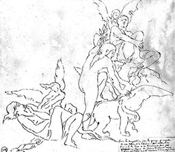 Inscr. b. dr. : faire la composition, avec le groupe principal / de mon tableau de la Chimère. en mettant les / figures à la base α en terminant par [mot barré] / [mot barré] une figure de femme tombant dans / l’espace pendant que la chimère s’élance vers le ciel
